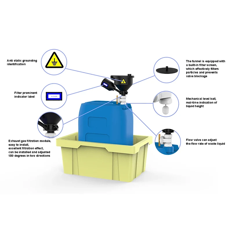 Vastatio liquoris collectionis notas miras notas habet. Eius collectionis receptaculum e rudibus materiis PP anti-staticis importatis, quae non solum stabilitatem materiae praestat, sed etiam efficaciter exercet munus antistaticae agentis, static electricitatem vasti liquoris infundibuli intra fines 10^5 ad 10^9 moderante, periculo calamitatum per electricitatem statorum causata valde minuendo. Infundibulum urbanum consilium habet. Leak-probatio capitis operculum obsignationis operculum et infundibuliformi-probationis sparguntur paratur, et valvae institui possunt prout opus est ad conservationem excrementi liquoris repositionis. Genus summi operculi counterweight automatice exhaurit emissionem gasi adaptat secundum condiciones pressionis internae aperiendi in 100Pa et in 50Pa claudendi, vitando explosionem et combustionem spontaneam. Exhaustae sparguntur gasi connectitur modo spirali, quod est ad reponendam et impedit volatilizationem partium chemicarum. V variae species in promptu sunt ad accuratam accommodationem ad varias curationes gasi exhauriendas.